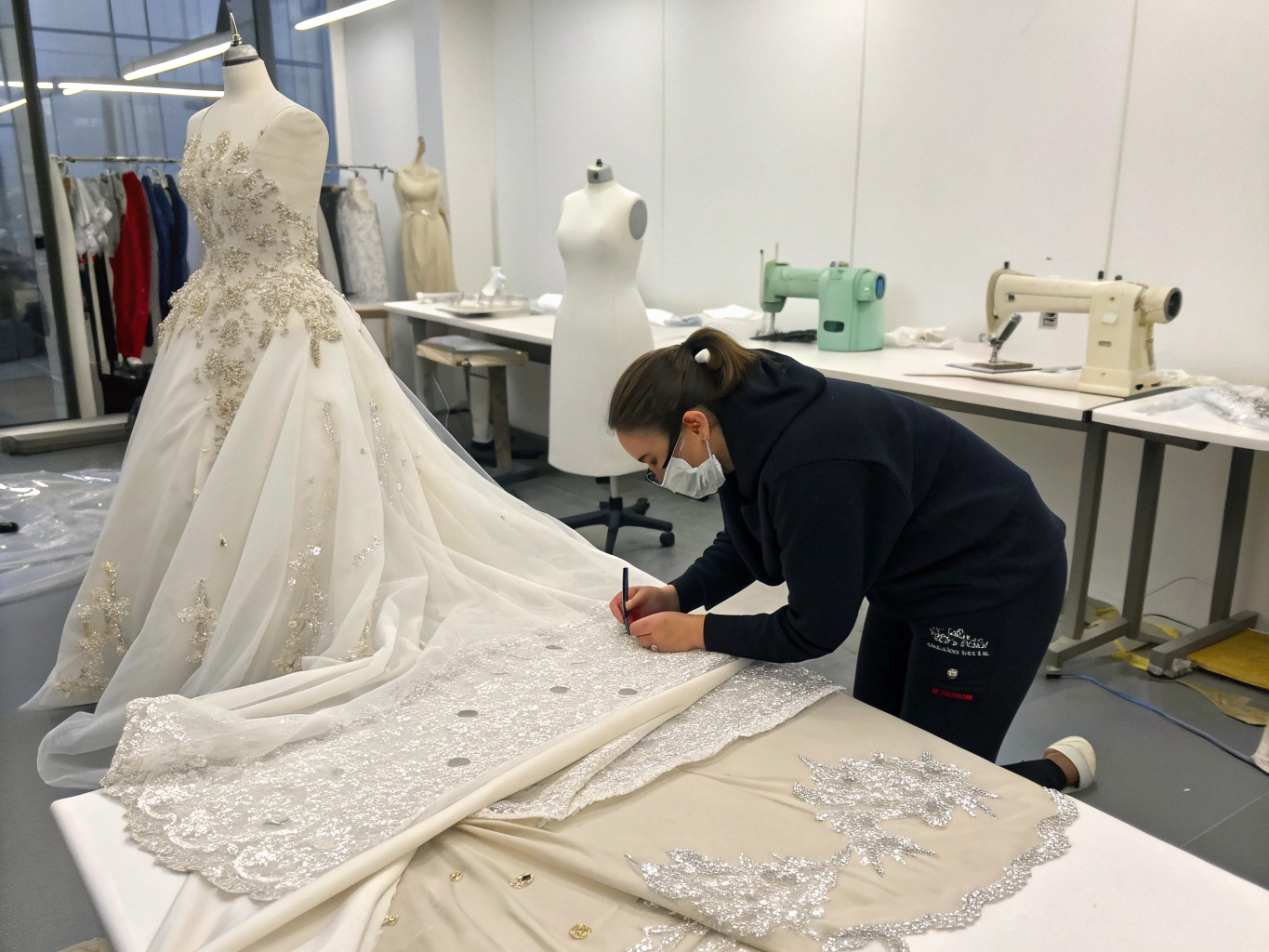 A beginner should allocate 80-120 hours for a simple A-line wedding dress. More complex designs with beading, multiple layers, or intricate lace work can require 150-200+ hours.