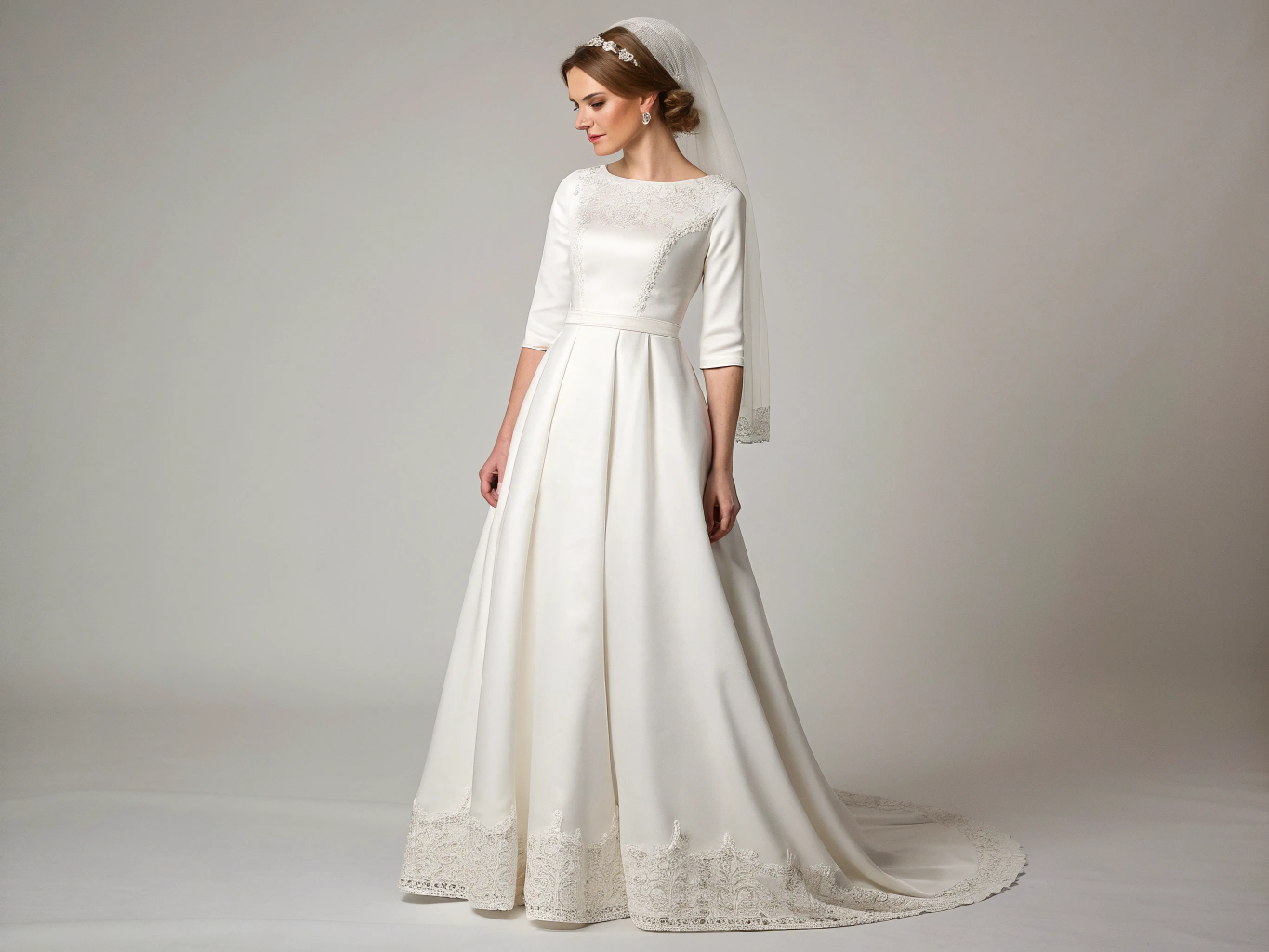 If you’re under 5’4″, empire waistlines and vertical seaming create elongating effects. Avoid overwhelming ballgown proportions—an A-line with a sweep train will photograph beautifully without swallowing your frame.