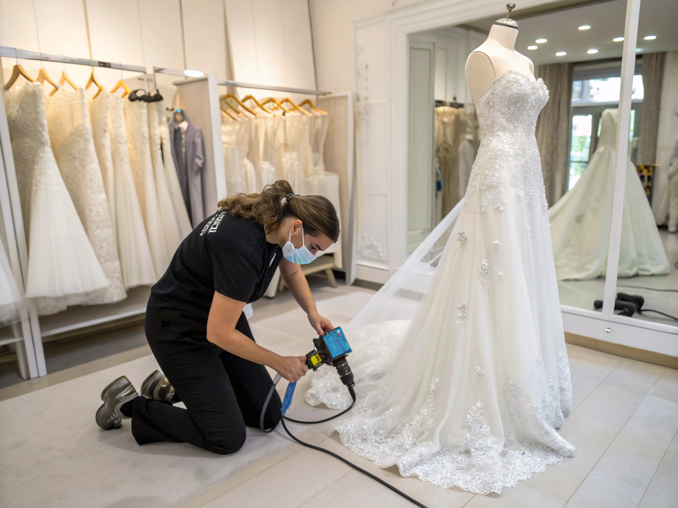 While technically possible, I strongly advise against it. Wedding dress cleaning requires specialized expertise that general cleaners typically lack. The risk of damage to delicate fabrics, loose beading, or improper stain treatment isn’t worth the potential savings.