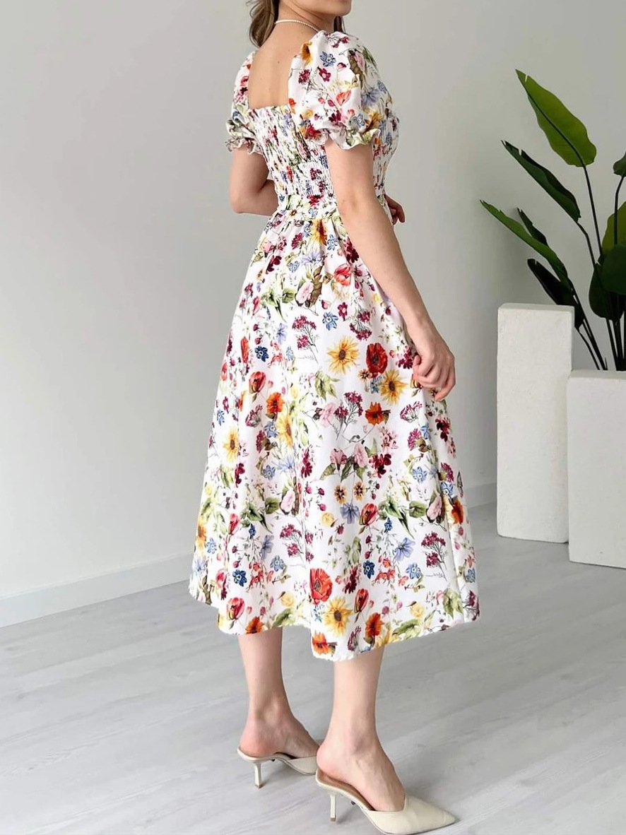 Clara – Vacation Casual Puff Sleeve Floral Midi Dress | FASHILYX