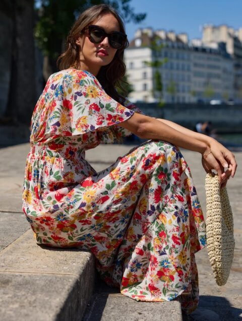 Isabella – Autumn Floral V Neck Flared Sleeve Maxi Dress | FASHILYX