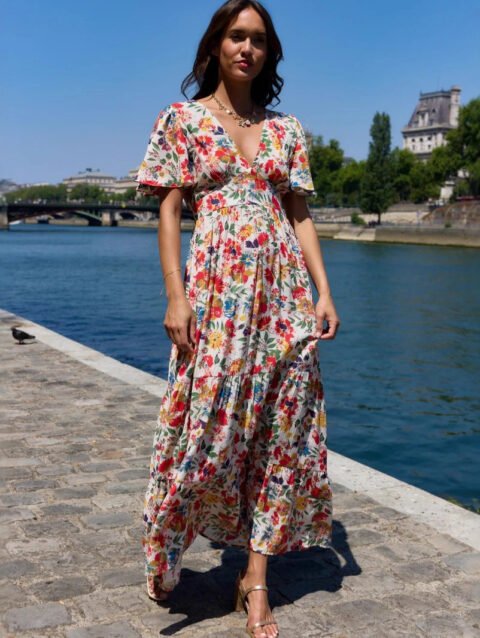 • Isabella – Autumn Floral V Neck Flared Sleeve Maxi Dress | fashilyx